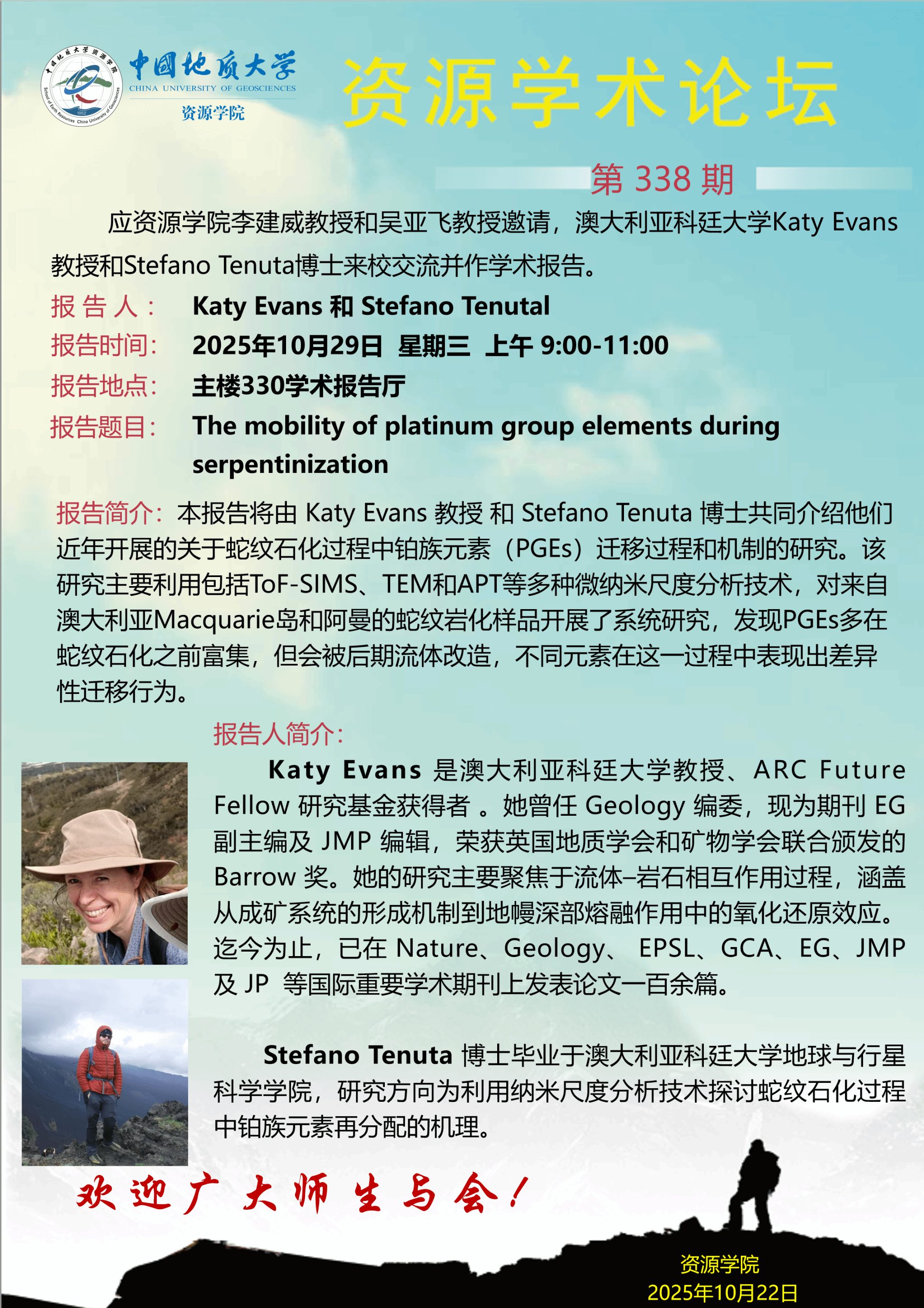 【10月29日】第338期资源学术论坛:Katy Evans、Stefano Tenutal学术报告