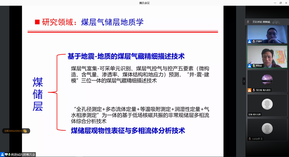 2020年12月15日,应学院严德天教授和周三栋教授邀请,中国地质大学(北京)姚艳斌教授同师生线上交流并作题为“煤储层物性与流体特征分析新技术:核磁共振”的学术报告。