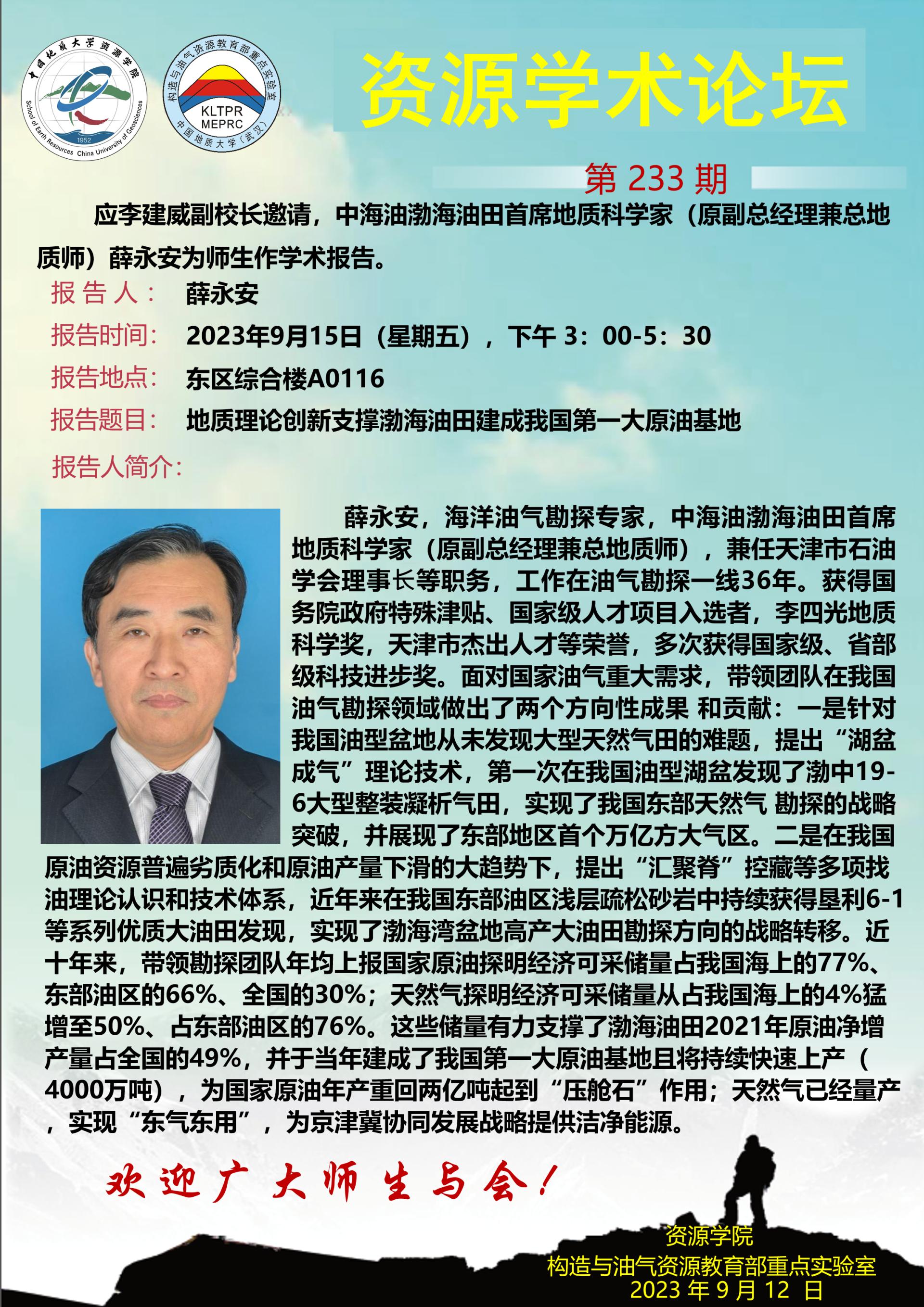 【9月15日】第233期资源学术论坛:薛永安学术报告