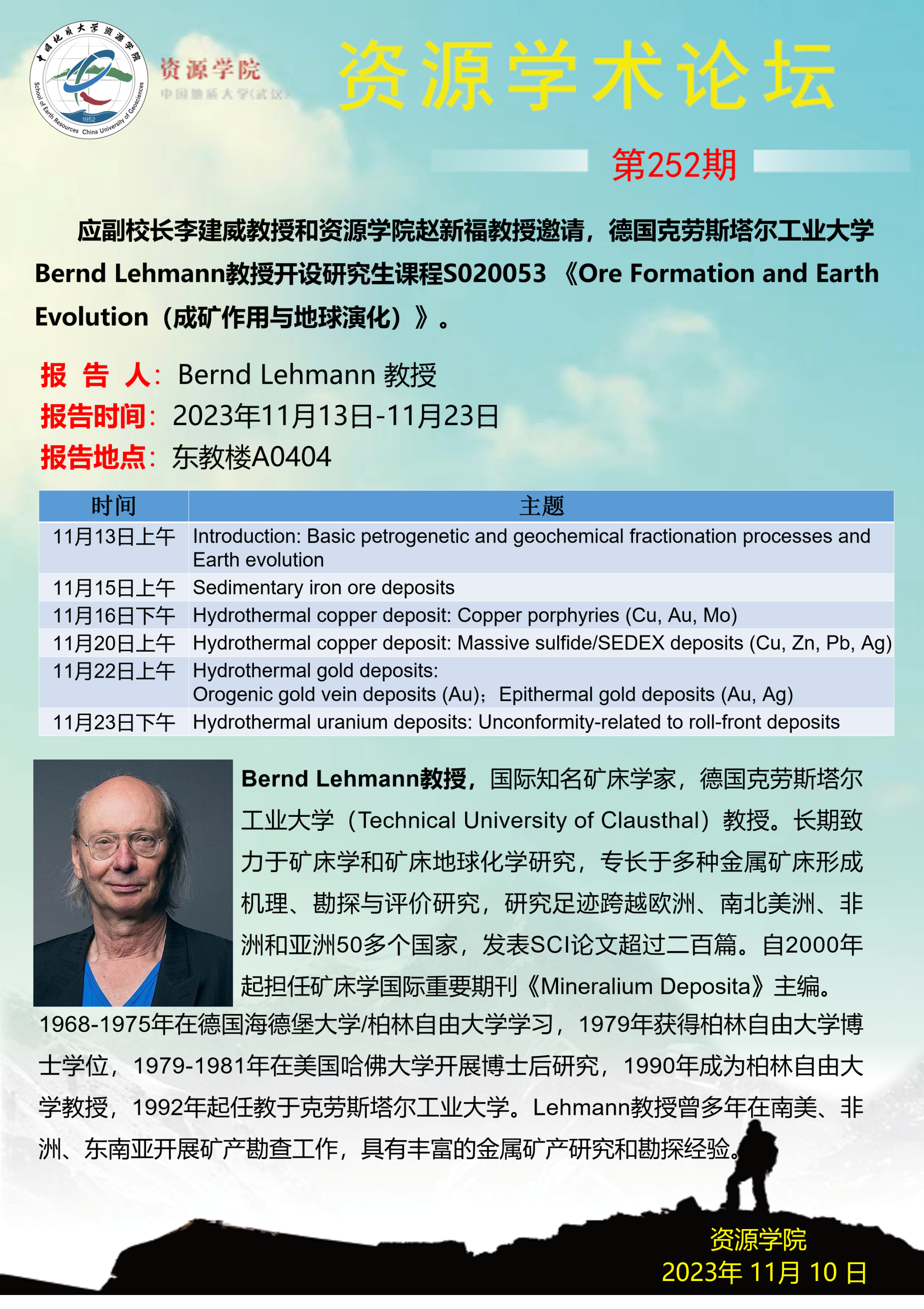 【11月13日-11月23日】第252期资源学术论坛:Bernd Lehmann学术报告