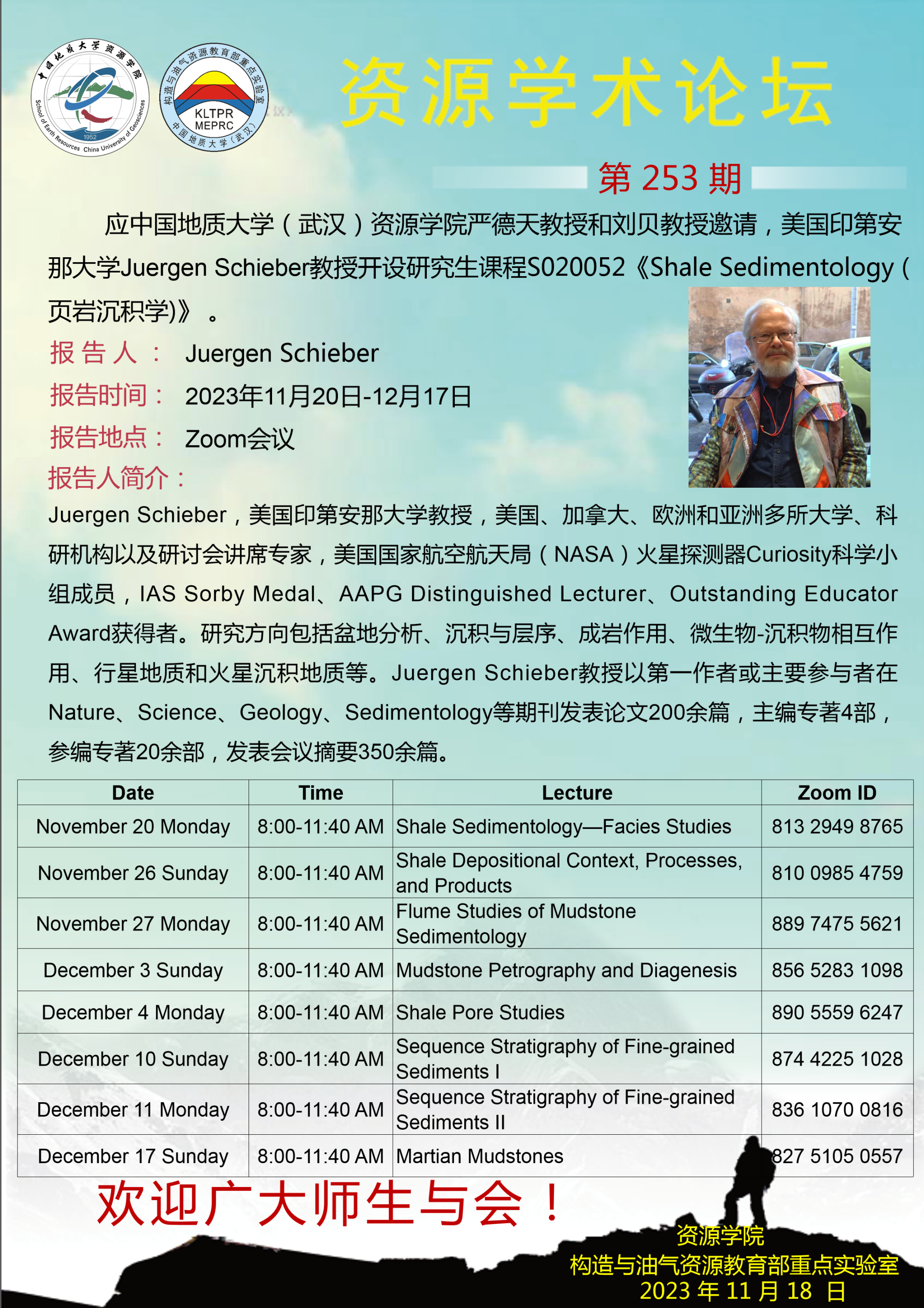 【11月20日-12月17日】第253期资源学术论坛:Juergen Schieber学术报告