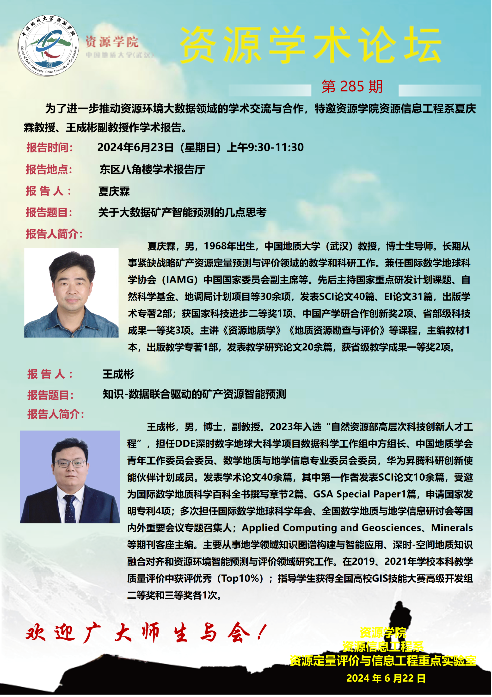 【6月23日】第285期资源学术论坛:夏庆霖、王成彬学术报告