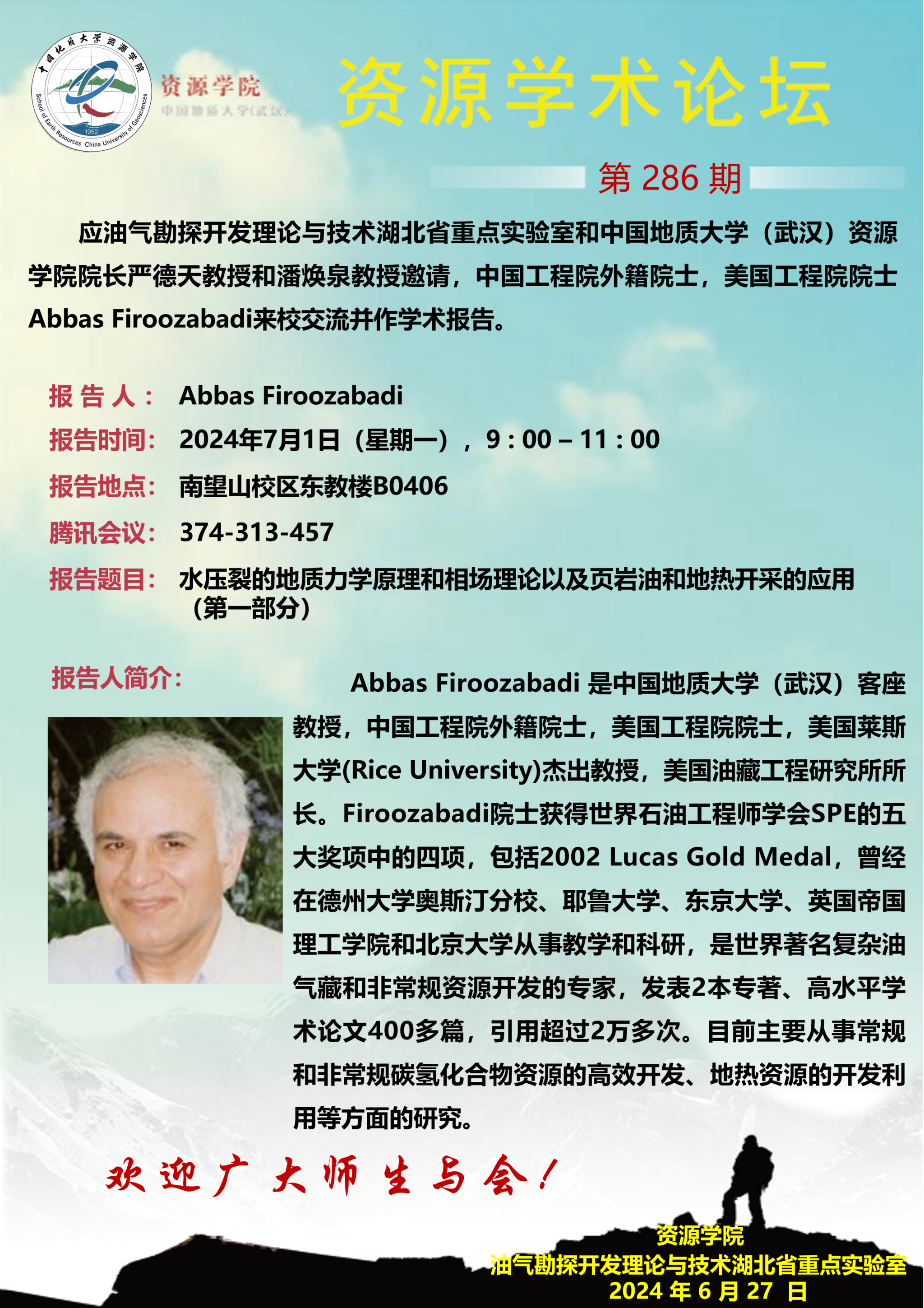 【7月1日】第286期资源学术论坛:Abbas Firoozabadi学术报告