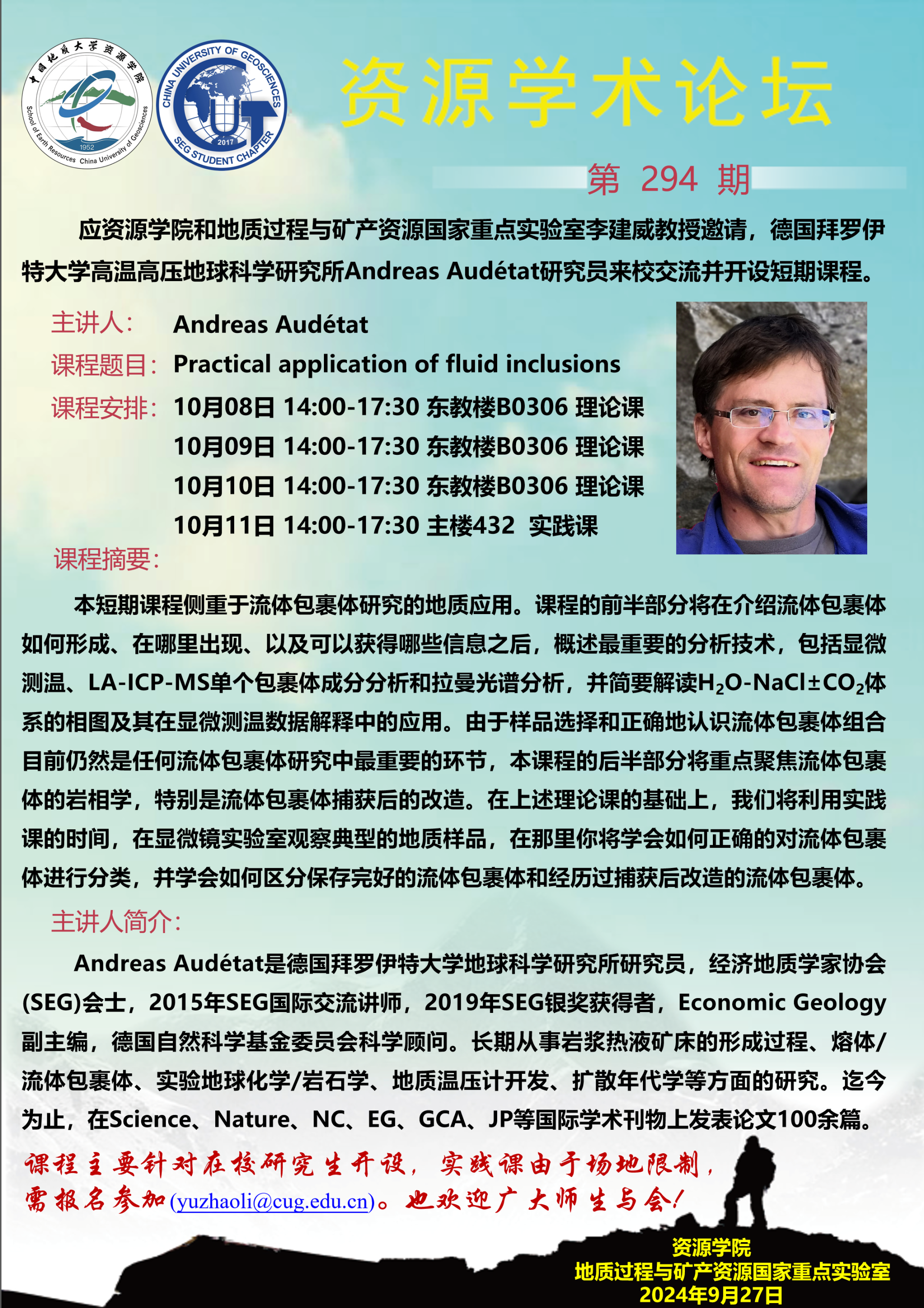 【10月8日-10月11日】第294期资源学术论坛:Andreas Audétat学术报告