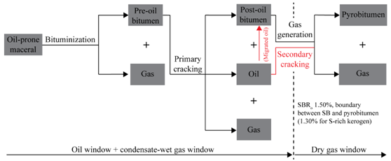泥页岩中的分散有机质包含5个显微组分组:镜质体、惰质体、类脂体、动物碎屑和次生有机质,每个显微组分组包含多种显微组分(表1)。不同显微组分的成因不同,生烃潜力也存在差异:类脂体生烃能力最高,镜质体和动物碎屑次之,惰质体基本无生烃能力。热演化过程中,镜质体、惰质体和动物碎屑的形貌特征未表现出明显变化,在过成熟泥页岩中仍可识别出这三种显微组分组(图1)。而类脂体在热演化过程中形貌特征变化较为显著。生油型显微组分在生油窗内通过沥青化过程转化为前油沥青,随着成熟度的增加,前油沥青逐渐转化为油气和后油沥青,后油沥青在干气窗内转化为焦沥青,同时油也会在干气窗内二次裂解为焦沥青(图2)。