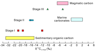(3)石英的H-O同位素、黑钨矿和锡石的O同位素结果表明,阶段Ⅰ的成矿流体δ18O流体=3.3-7.0,δD=-76 ~ -61主要为岩浆水;阶段Ⅱ(δ18O流体=1.3-1.8‰,δD=-81 ~ -71‰)和阶段Ⅲ(δ18O流体=-3.1 ~ -1.6‰,δD=-89 ~ -73‰)的成矿流体的δ18O流体和δD值逐渐降低,表明阶段Ⅱ开始有大气降水加入,并在阶段Ⅲ大气降水占主导地位(图4)石英流体包裹体中提取的CO2的碳同位素组成(δ13Cco2=-20.5 ~ -4.9‰)表明,阶段Ⅰ的成矿流体主要为岩浆水其碳同位素组成由于沉积地层中有机碳的混入而发生改变,加入的有机碳随着时间推移被逐渐消耗,在阶段Ⅲ几乎消耗殆尽(图5)。