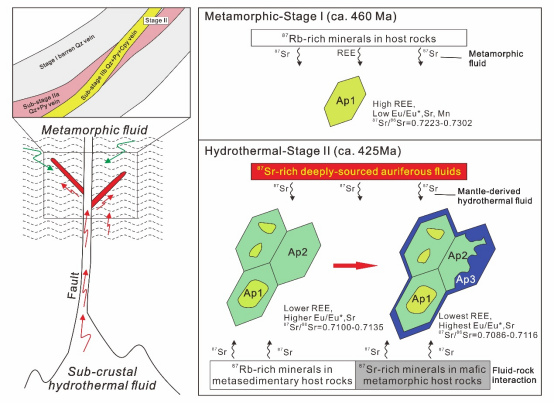 本研究表明,磷灰石是造山型金矿床成矿体系中变质-热液演化的有效“矿物探针”,其精细结构-年代学-元素-同位素特征可以有效约束造山型金矿床成矿体系的成矿时代和变质-热液成矿过程。该研究成果发表在地质学国际知名期刊《Geological Society of America Bulletin》上,论文第一作者为免费看a片