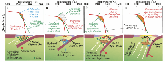 研究表明,Zambales蛇绿岩从早到晚发生了四期铬铁矿成矿事件,对应的类型依次为富Ti高Al型、贫Ti高Al型、富Ti高Al型和高Cr型(图1),基本涵盖了全球蛇绿岩型铬铁矿常见的成分类型。其中,富Ti高Al和贫Ti高Al型铬铁矿对应的成矿岩浆分别属于一般亏损和极度亏损的低Ti拉斑质系列,高Cr型铬铁矿的成矿岩浆则为高Ca玻安质或具有相关成因联系的苦橄质。这种成矿岩浆作用组合及发生的时间顺序,与西太新生岛弧成弧前发育的岩浆作用演变趋势最为吻合,在其它大地构造环境中并不发育,支持上述类型铬铁矿的成矿均大概率发生于洋内初始俯冲的环境。