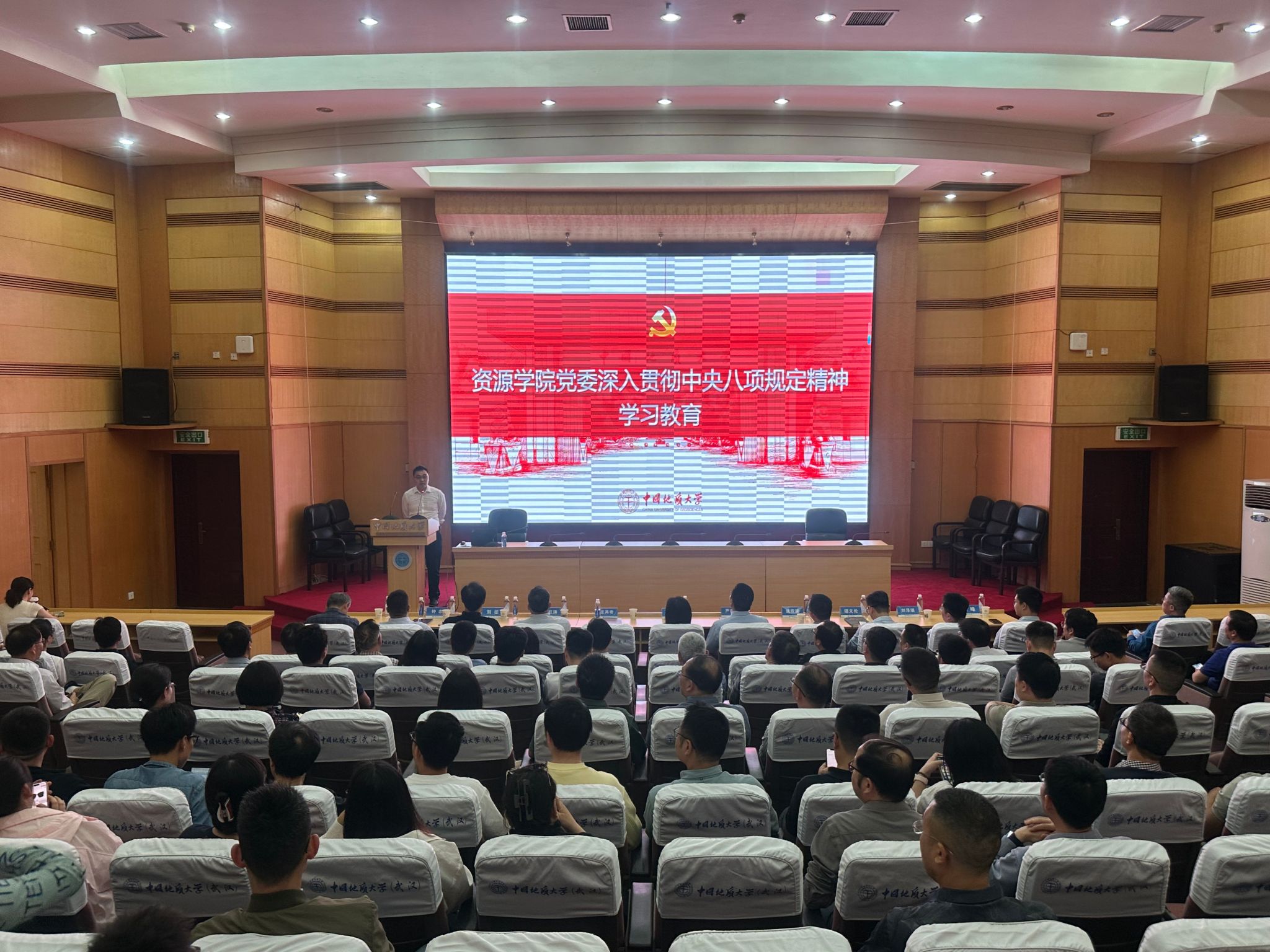 深入贯彻中央八项规定精神学习教育在迎宾楼一楼报告厅举行,学院全体教职工参加学习,学院党委书记汪再奇主持学习并总结讲话。