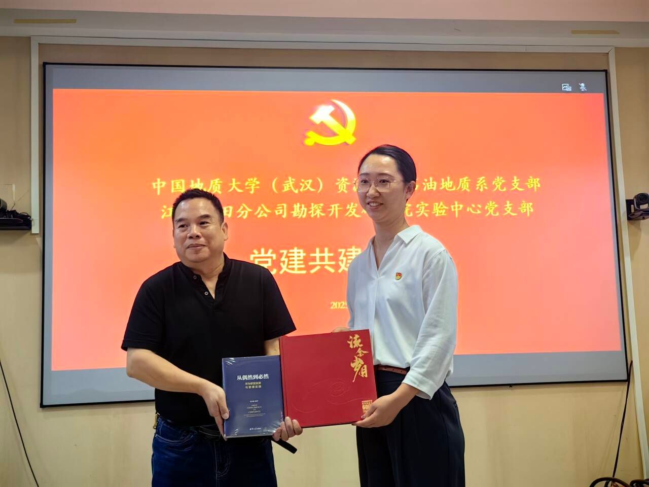 江汉油田勘探开发研究院实验中心向石油地质系党支部赠送《江汉油田研究院建院60周年纪念册》一书。