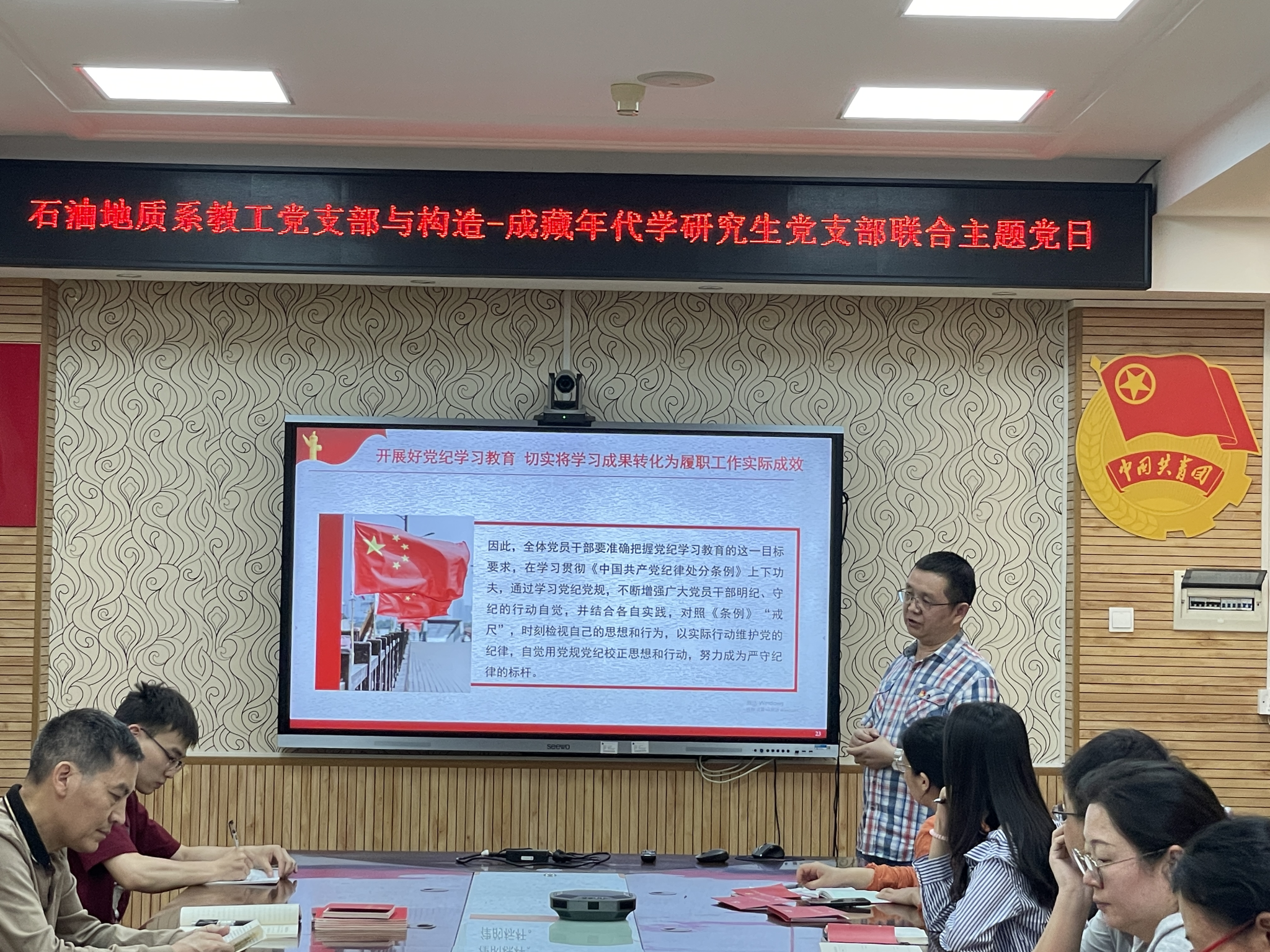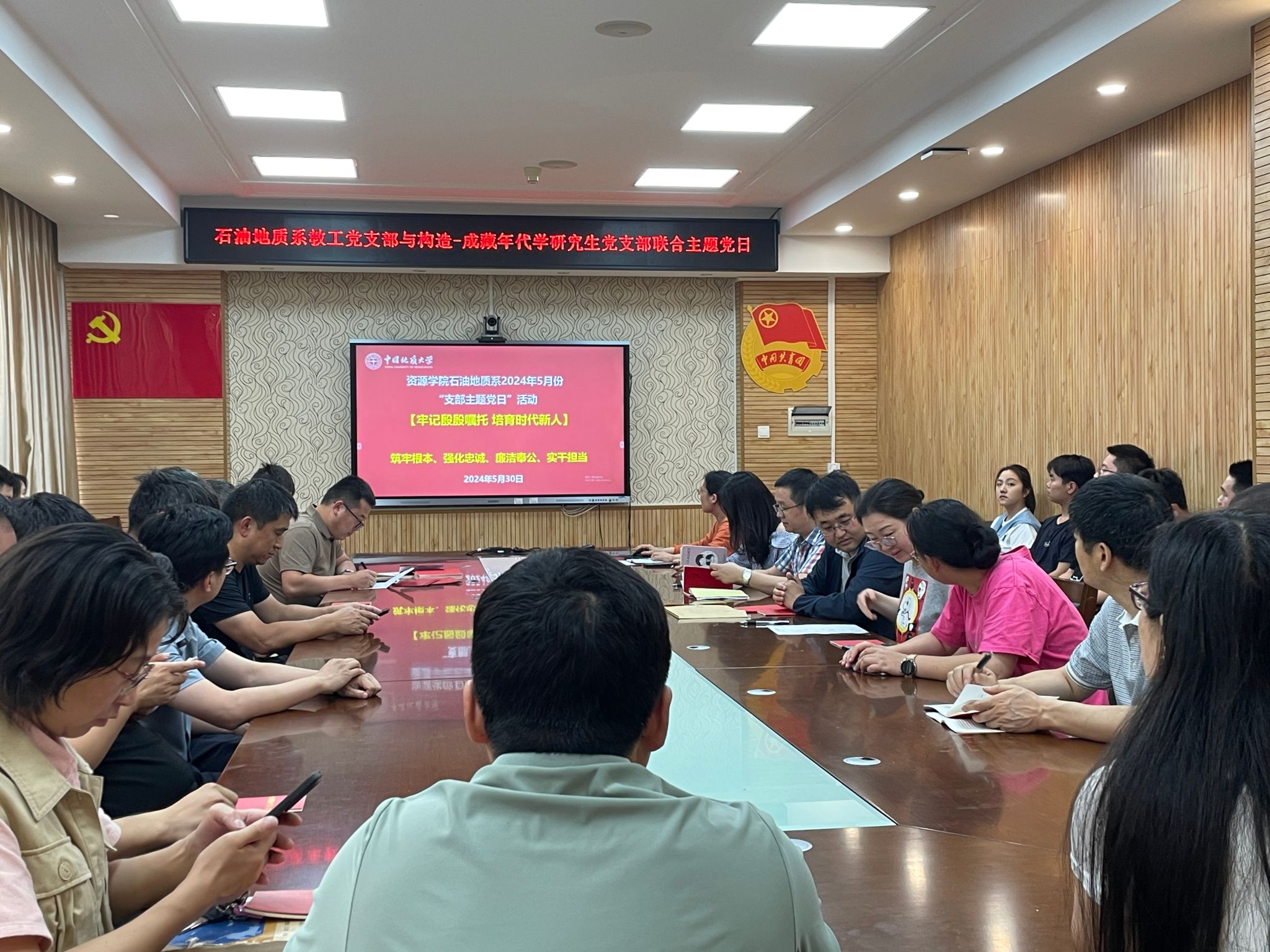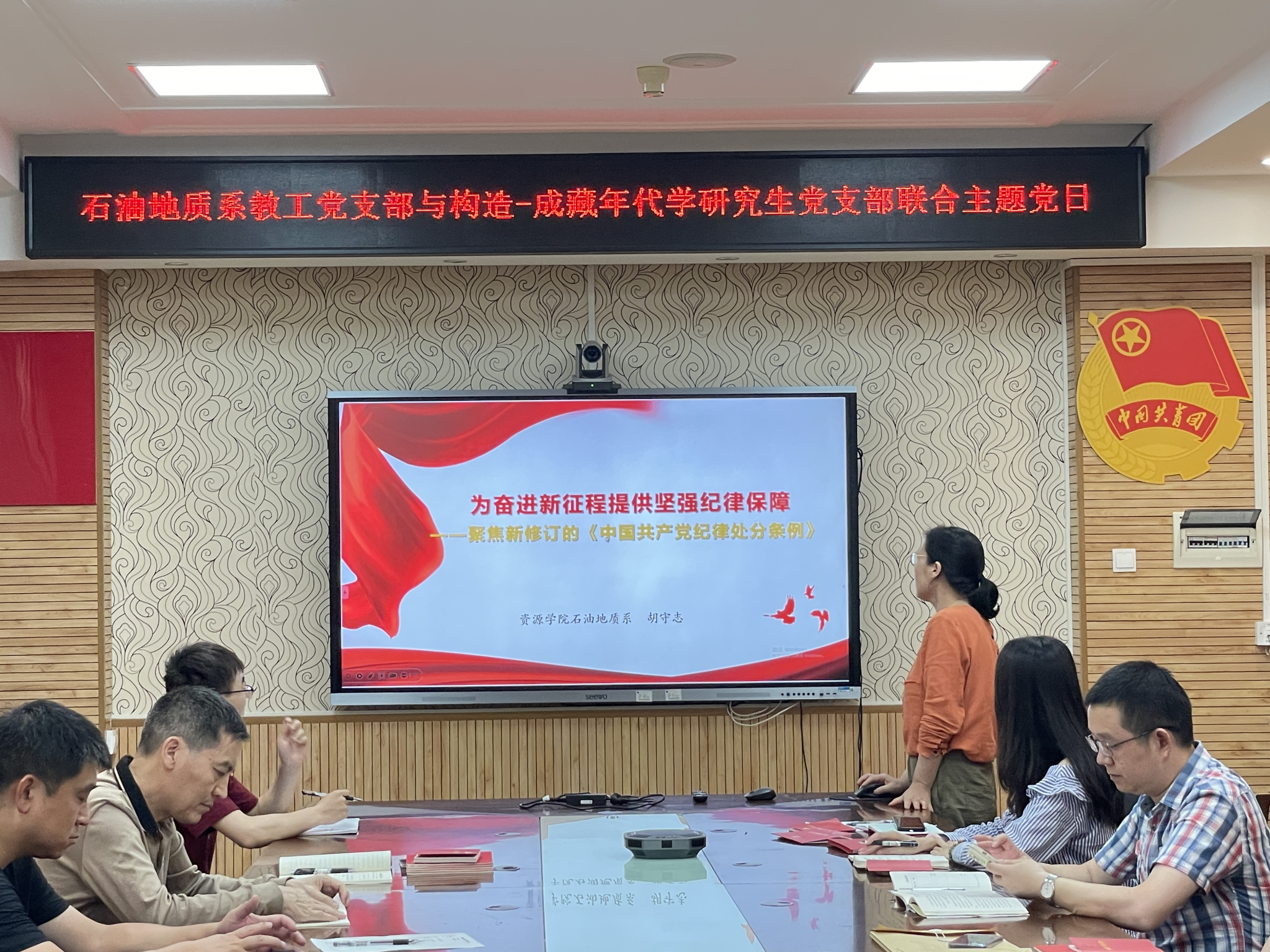 (通讯员 吕志华)5月30日下午,石油地质系教工党支部与构造-成藏年代学研究生党支部联合开展“牢记殷殷嘱托 培育时代新人”主题党日活动,学院副院长沈传波、石油地质系教工党支部书记胡守志分别向师生党员讲党纪学习教育专题党课。胡守志主持会议。