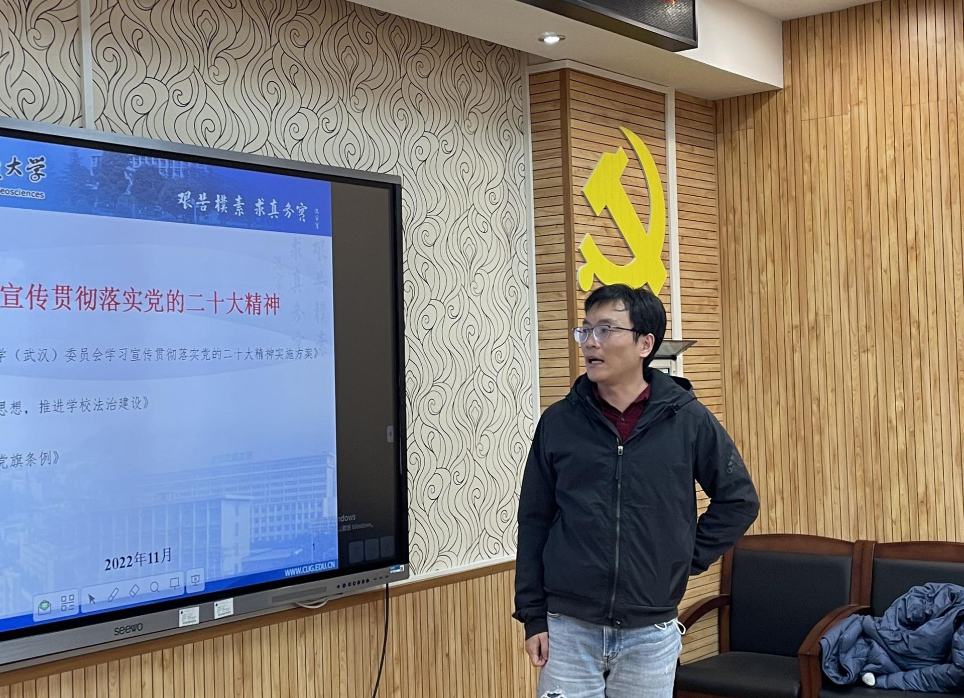 系主任蒋恕发言,他谈了学习党的二十大报告中关于能源资源内容的体会,告诫青年教师要以学科发展为己任,以即将召开的“学科建设讨论会和青年论坛”为契机,互相交流,增进了解,共同进步。