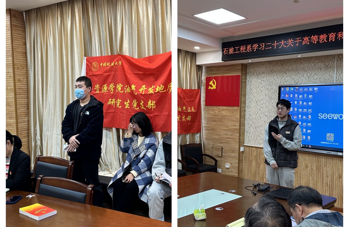 油气开发地质研究生党支部书记张阿芮、钻采工程研究生党支部李涛、本科生党员代表高旭东结合自己求学经历谈了学习党的二十大精神的感悟。他们说到,老师们对待教学计划精心准备、对待科研严肃认真、对待学科建设长远规划的态度令人印象深刻,并对本科课程实践环节的设置提出了建议。