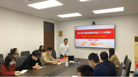 副院长沈传波作党的二十大精神专题辅导员报告。他从党的二十大报告的主要内容、党的二十大的重大意义和重大成果、自身学习体会三个部分领学党的二十大精神。他重点解读了大会主题、过去五年的工作和新时代十年的伟大变革、开辟马克思主义中国化时代化新境界、新时代新征程中国共产党的使命任务等内容并讲到,党的二十大报告对党和国家各项事业做出战略部署,描绘了全面建设社会主义现代化国家、全面推进中华民族伟大复兴的宏伟蓝图。他重点从“党始终坚持以人民为中心的发展思想”“肩负立德树人神圣使命,求实问真服务祖国发展”两方面,结合党的二十大关于“不断实现人民对美好生活的向往”内容、师德模范故事、自身成长经历等交流学习体会。他向同学们推荐了《习近平谈治国理政》四卷书籍、《初心》《最美的青春》两部电视剧和围绕甘祖昌将军及其夫人故事创作的系列影视剧作品,强调党员同志要加强政治理论学习,传承弘扬老一辈革命家精神。
