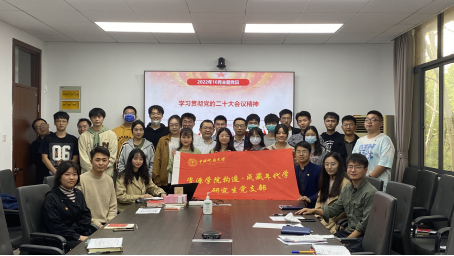构造-成藏年代学研究生党支部在信工楼319举行学习贯彻党的二十大精神主题党日。副院长沈传波,党委副书记谭文伦,辅导员霍少孟,支部全体党员以及党员发展对象、入党积极分子参加专题学习,党支部书记万晓帆主持会议。会议应到党员23人,实到党员22人(其中4名公派留学生党员在线参会),1人因事请假。