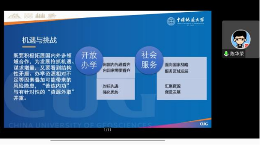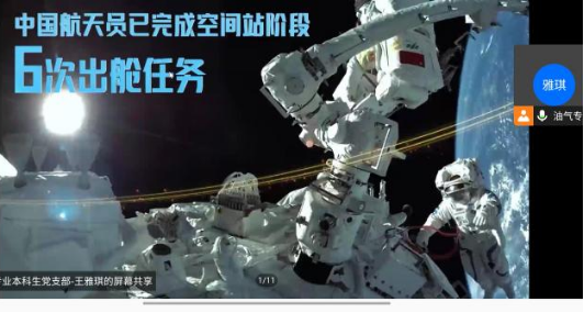 参会师生交流发言。学生党员高原、王雅琪两位同志谈到粤港澳大湾区所在地是南海深水油气勘探开发的重点区域,作为地大资源人,将苦练内功,为保障国家资源能源安全贡献青春力量。