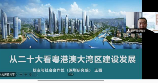 校友与社会合作处副处长、深圳研究院副院长王强讲授专题党课。他以《从党的二十大看粤港澳大湾区建设发展》为题,结合《粤港澳大湾区发展规划纲要》和党的二十大报告中关于粤港澳大湾区建设的表述,从基本概况、综合实力、对标分析、协同创新四个方面介绍了粤港澳大湾区建设的非凡十年。他讲到,建设粤港澳大湾区是习近平总书记亲自谋划、亲自部署、亲自推动的重大国家战略,是新时代中国特色社会主义事业发展的重要引力。他还介绍了粤港澳大湾区的优秀校友事迹,激励同学们专注学业、综合发展,为将来到更宽广的舞台绽放光彩打牢坚实基础。