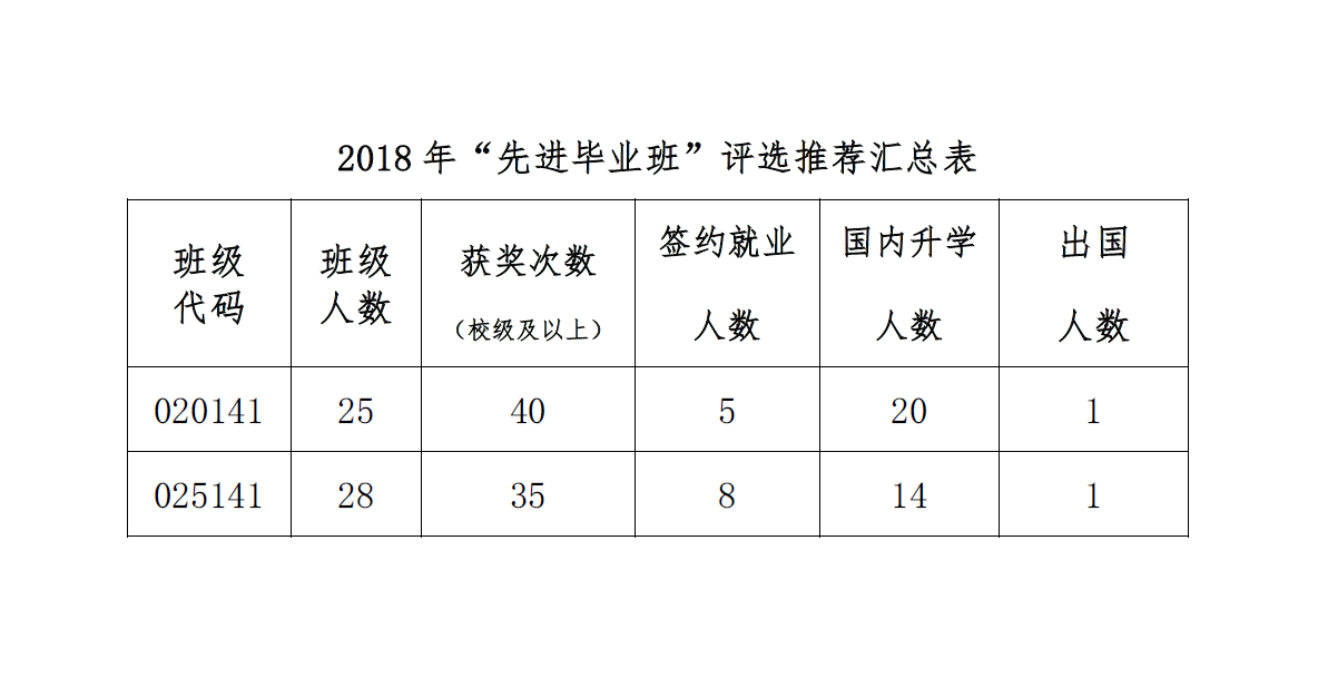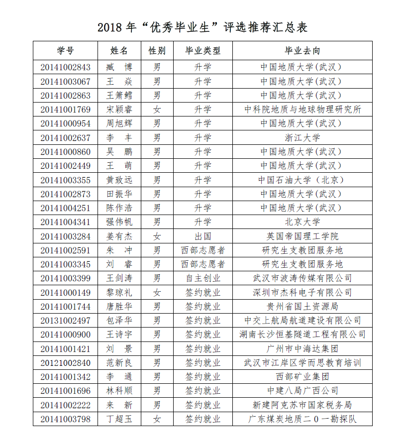 经学生个人申请和学院综合评审,现评选出020141、025141等2个班级为2018年先进毕业班,遴选出藏博等26名同学为2018年优秀毕业生,现将名单公示如下: