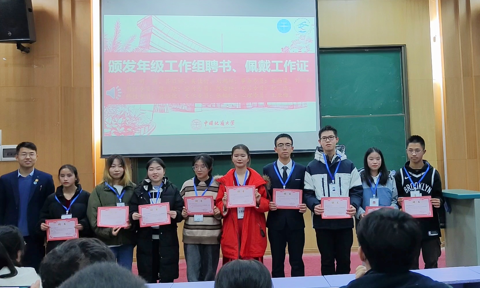 霍少孟为2021级本科生工作组同学颁发聘书,佩戴工作证。