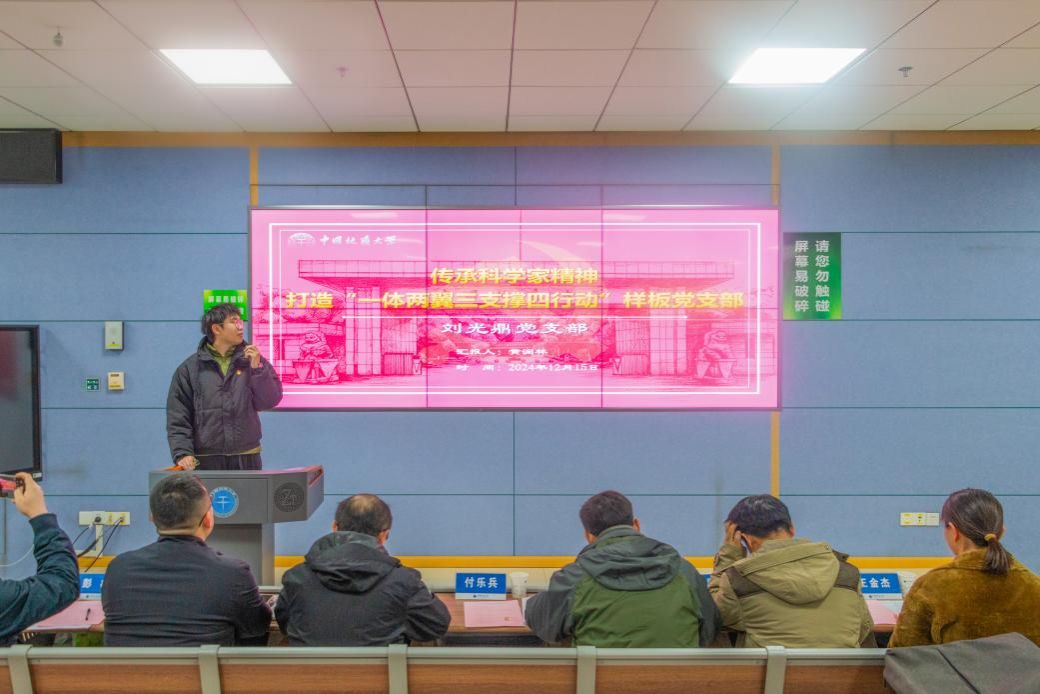 地球物理与空间信息学院刘光鼎党支部黄润林以《传承科学家精神 打造“一体两翼三支撑四行动”样板党支部》为题介绍样板支部培育创建经验。