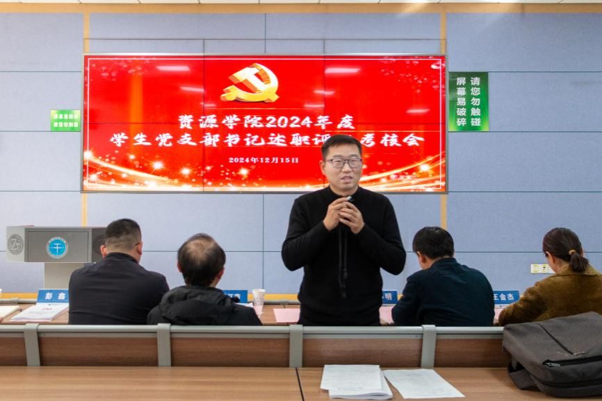 谭文伦总结讲话。他表示,本次述职会议是对学院年度党建工作的一次重要总结,也是一次学习交流。2024年,在学院党委的坚强领导下,各党支部能够紧紧围绕中心工作,认真履行党建工作主体责任,不断创新党建思路,强化工作举措,取得了一定成效,但还存在差距。他讲到,各学生党支部要按照学院党建“双创”工作部署,对照“七个有力”持续加强样板支部培育创建,一是强化党性教育,各党支部要充分发挥学院党建指导员和党支部战斗堡垒作用,创新理论学习方式,深化学习成果转化,增强理论素养和政治自觉性,引导党员们树立正确的价值观和良好的行为准则,做到学思践悟、知行合一;二是要强化纪律意识,学生党员要以身作则,严于律己,学生党支部要认真落实全面从严治党要求,提高党员队伍建设质量;三是强化结对共建,持续加强教工党支部与学生党支部结对共建,巩固“党-团-班、师-研-本”工作格局,以党的建设促进导学团队和班级建设;四是强化品牌意识,深入结合学科特色与专业优势,总结经验,挖掘亮点,明确思路,创建培育更多具有资源特色的样板党支部,促进支部建设与学生成长同向同行、互融互通,为服务能源强国的伟大事业注入坚定的红色动能。