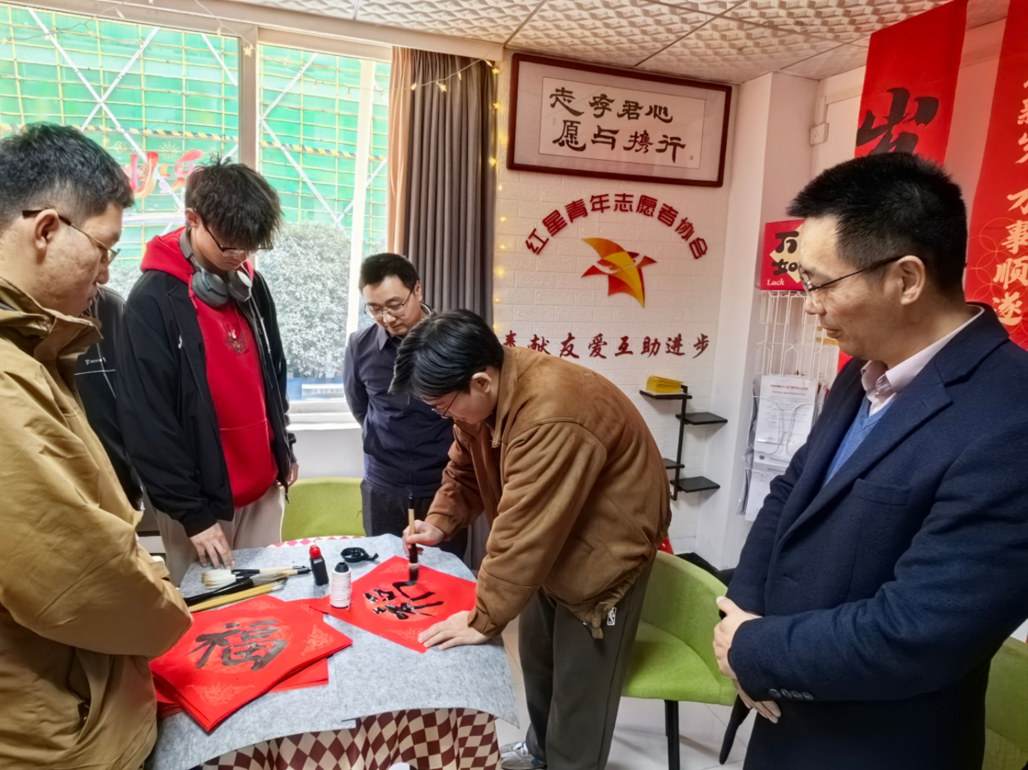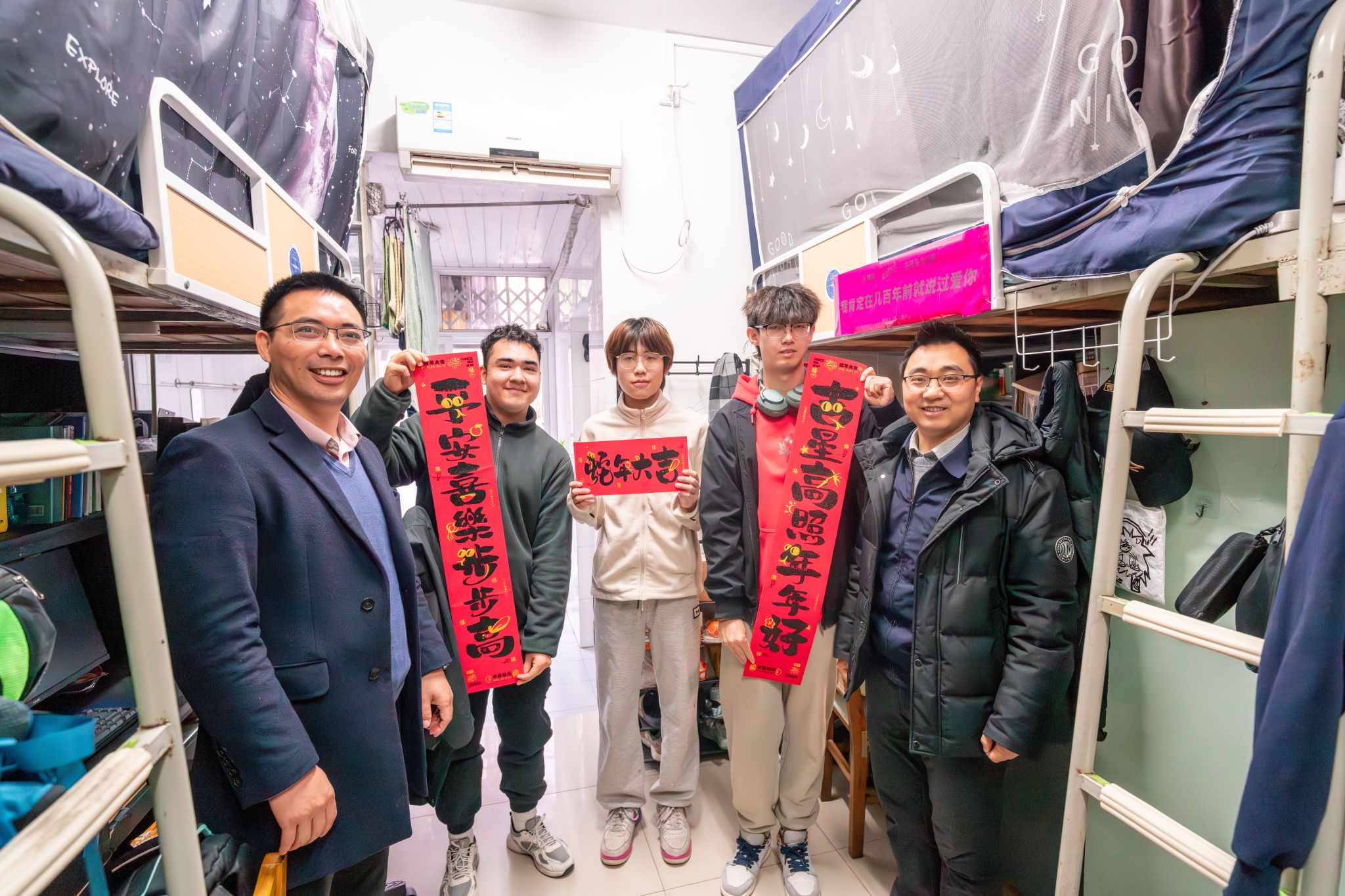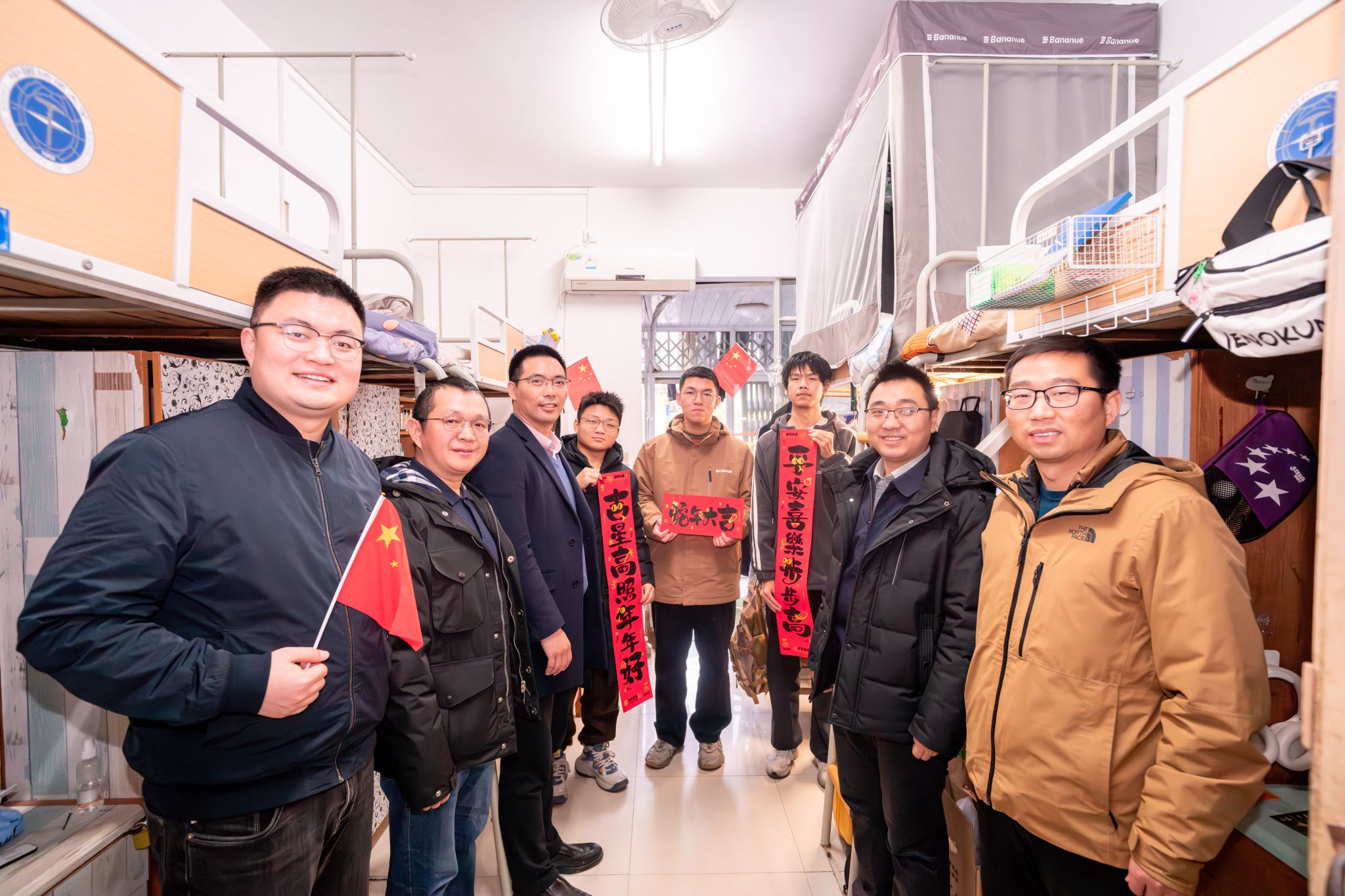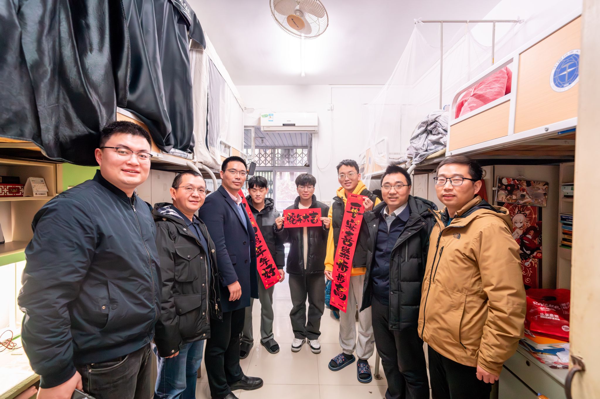 会后,汪再奇、严德天一行走进宿舍,与同学们亲切交流,为同学们送上新年祝福和对联。