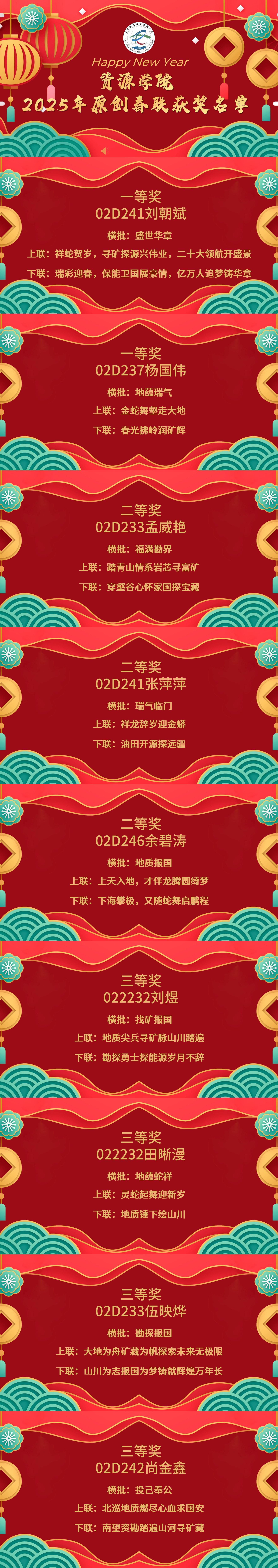 汪再奇、严德天了解了同学们近期学习生活情况,倾听了同学们在学业、生活等方面的诉求,耐心解答了同学们的问题,并向大家致以新年问候,希望同学们在新的一年立新目标,展新风采,幸福快乐,健康成长。随后,院领导为2025年原创春联作品获奖个人颁发奖品。