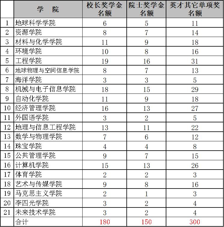 1.“地大英才奖学金”项目(“李四光英才奖”、“少数民族学生奖”、“创业之星奖”除外)采取等额评选办法,学院具体名额见下表: