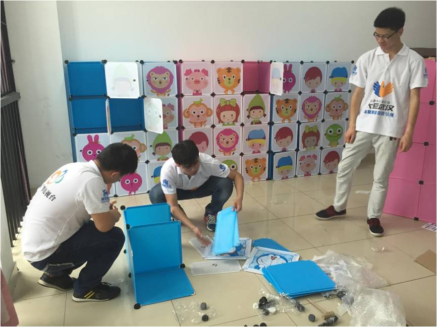 刚到达目的地,迎面而来的一个浩大工程就是要把几千本书籍搬运到五楼的阅览室。面对如此浩大的工程,在场的老师和志愿者们互相加油打气,一捆捆书籍、一步步台阶,在历经近两个小时后,如数搬到五楼阅览室。为了让孩子们尽早享受到阅读的快乐,志愿者们没有停歇,按照活动分工开始书屋的搭建。大家各司其职,分工协作,有的在负责安装书架,有的在给书籍整理分类,有的在手绘阅览室墙壁,终于在晚上8点钟,完成了2个阅览室的美化,8个书架的安装,3600余本书籍的归类。当聋哑学校的孩子们走进阅览室后,尽管他们不能用语言表达,但志愿者们能从孩子们充满笑容的表情中感受到他们内心的的喜悦,他们纷纷走到书架前开始选择自己钟意的书籍。最后,在志愿者与聋哑学校的孩子们共同见证下,聋哑学校杨校长与王向东老师一起为“武汉第一聋哑学校0010号爱心南望书屋”和“免费看a片
