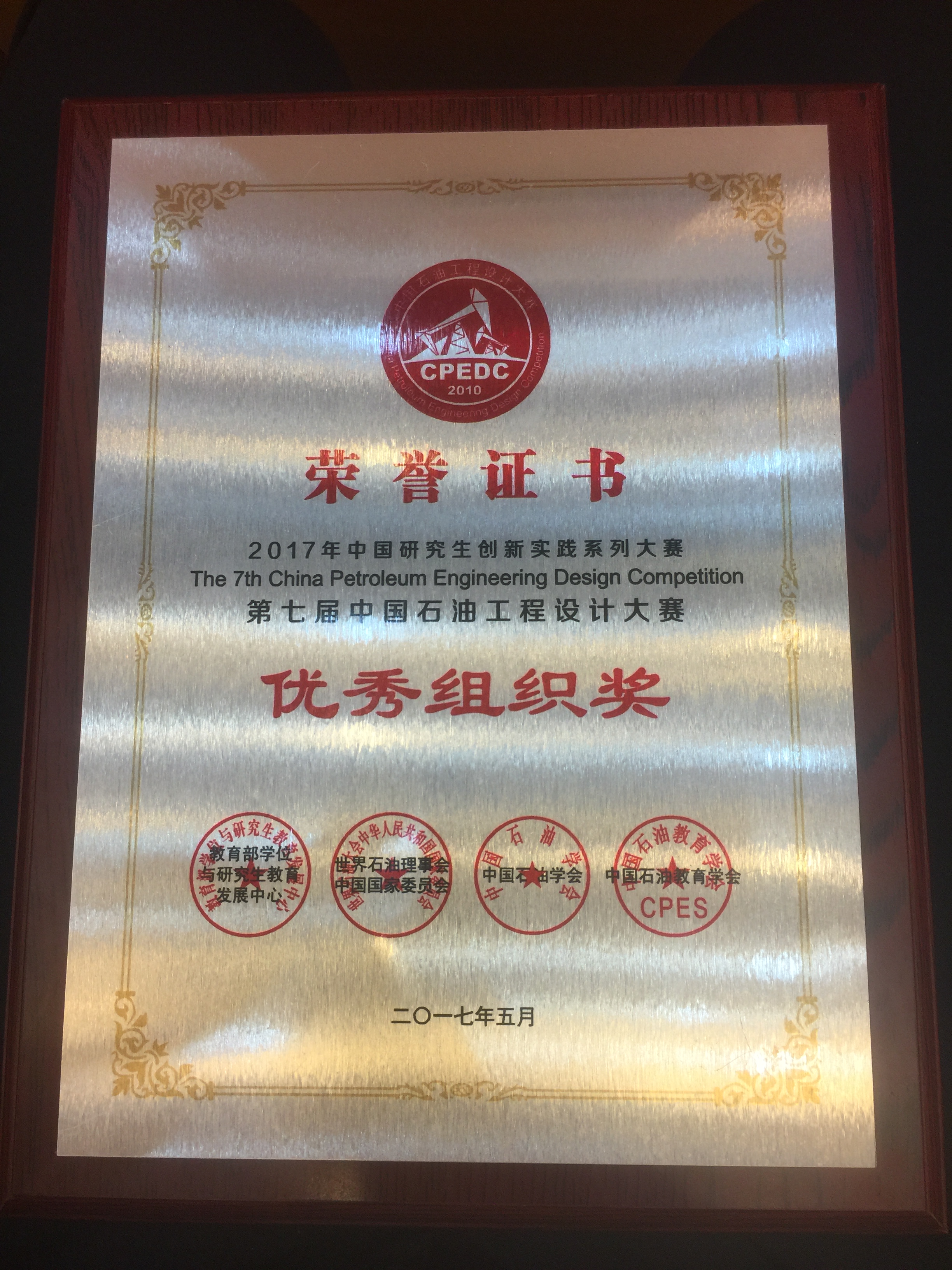 中国石油工程设计大赛作为中国乃至国际石油界学生科技活动一年一度的盛宴,受到各参赛高校的高度重视,竞争异常激烈。本届大赛选取深海油气田开发为赛题,设有方案设计类综合组、方案设计类单项组和技术创新组3个组别,吸引了国内外近百所所高校及科研院所的2879支队伍参加,收到有效作品1010份,最终有62支优秀队伍入围全国总决赛。本届大赛中我校共荣获全国二等奖1项,三等奖2项,优秀奖3项,关振良等3人获评优秀指导老师,王向东等2人获评先进个人,此外,我校还荣获“优秀组织奖1项(全国78所参赛单位获评4个),整体获奖数量创历史新高。