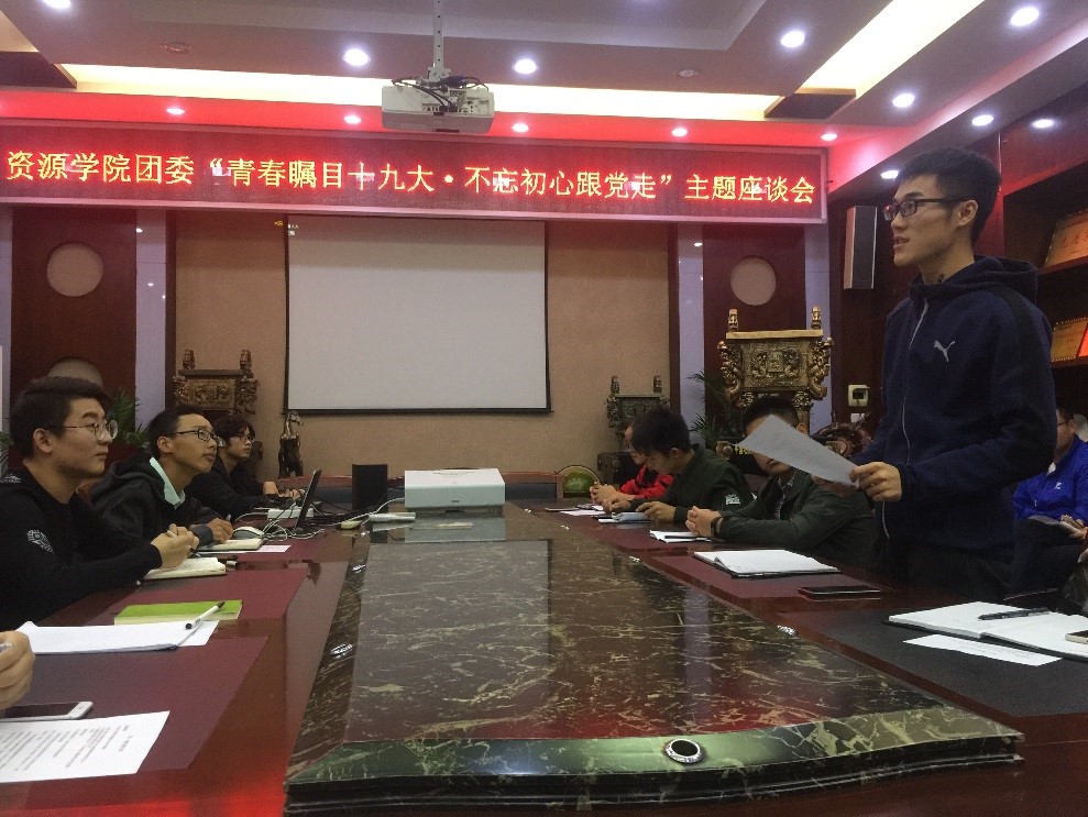 团委组织团员代表召开“青春瞩目十九大,不忘初心跟党走”主题座谈会,团员代表结合自己的学习生活,在会上热议学习十九大精神后的学习体会。团学联主席张彪表示,期待已久的党的十九大胜利开幕,令我即振奋又触动。习大大说:青年兴则国家兴,青年强则国家强。青年一代有理想、有本领、有担当,国家就有前途,民族就有希望。在新时代的召唤下,我们青年一代,要努力学习,做到品德高尚,基础厚实,专业精深,知行合一,接好实现中国民族伟大复兴中国梦的接力棒,完成时代赋予我们的使命。