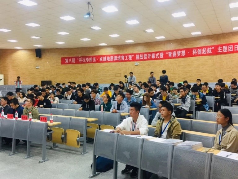 第十九届青年科技节系列活动为契机,举办第八期“寻找李四光•卓越地质师培育工程”挑战营开幕式暨“青春梦想·科创起航”主题团日活动。校团委科技实践部部长吴仁喜、院党委副书记张建华、院团委书记王向东、团委副书记刘明辉、资源系青年教师徐耀明副教授,以及全校200余名青年团员参加了活动。