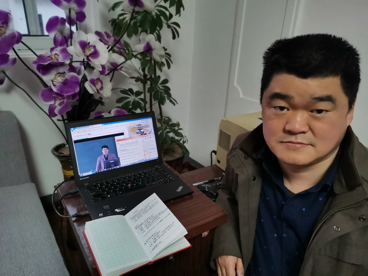 学生在家用电脑观看《矿产勘查理论与方法》课程直播,同时用手机看PPT和做笔记