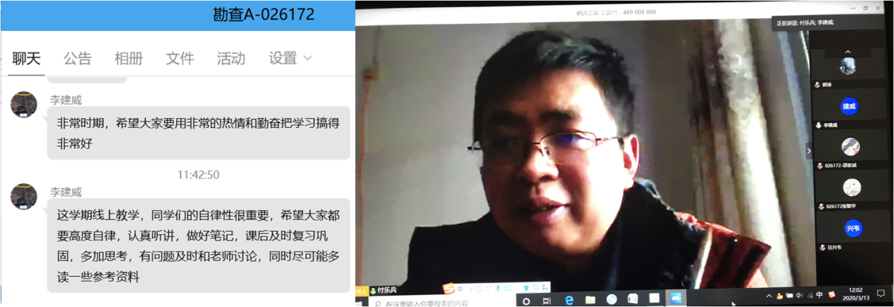 院长李建威认真聆听《非常规油气地质学》和《矿产勘查理论与方法》等课程,在课程间隙他主动与同学们开展线上互动,探讨专业问题,引导学生主动思考。课后,他勉励同学们:在特殊时期要用非常的热情与勤奋把学习搞得非常好;切实做到自我管理、自我约束和自我教育,养成自律的好习惯,努力培养和提高自学能力,这种能力将让你受益终生。