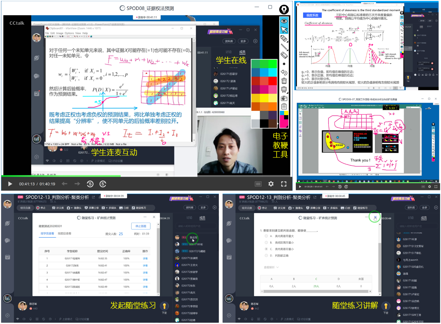 对具有学习管理系统功能支持的直播教学平台来说,直播上课打卡完全是不必要的,选课学生何时在线都被记录在教育数据中,例如CCtalk学习群内成员会自动区分为参加中和未参加两种状态,直播结束后会提供基本的直播数据。老师们更多关注的应是在屏幕后学生学习投入情况:人是否在屏幕前,是否跟随教学进度。通常,我在CCtalk直播中,我会随机发起一次随堂练习来了解学生在线情况和关注直播情况,我还利用了华南师范大学未来教育研究中心研发的课堂酷(//www.ketang.cool/)这款极简在线教学工具,发起在线调查(纸条范)和随堂抢答测验(快抢)。对重点难点知识内容,通过邀请学生上麦来回答问题,或同时连麦多个同学进行小组合作解答问题。在直播课堂中也注重学生课后作业的完成情况的通告,对完成优秀的学生进行表扬,对存在疑难的问题进行讲解。除了课堂内加强师生互动之外,我也在CCtalk中发起专题讨论贴,来促进学生互动,发现学习活跃的学生,增强CCtalk学习环境对学生的粘性。通过连麦对话、随堂测试、快速抢答、课后作业、在线实习等各种教学活动,有机联动与互动,促进学生知识理解与掌握,同时也在积极尝试和准备师生协同编辑思维导图进行头脑风暴共建课程知识体系、基于学生完成的读书报告进行在线展示,等等,从而循序渐进、不断优化混合式教学模式。