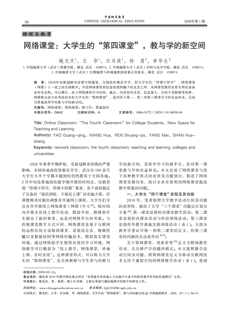 编者按:当前,新冠肺炎疫情蔓延势头得到有效遏制,防控工作取得阶段性成效,为深入贯彻落实习近平总书记关于统筹推进疫情防控和经济社会发展的系列重要讲话精神,在学校统一部署下,免费看a片 全体教师克服重重困难,创新运用线上教学新形式,积极总结教学经验与成果。《线上教学进行时》第十期,让我们一同了解姚光庆,王华,任双坡等五位教师发表在《中国地质教育》期刊上的文章《网络课堂:大学生的“第四课堂”,教与学的新空间》。