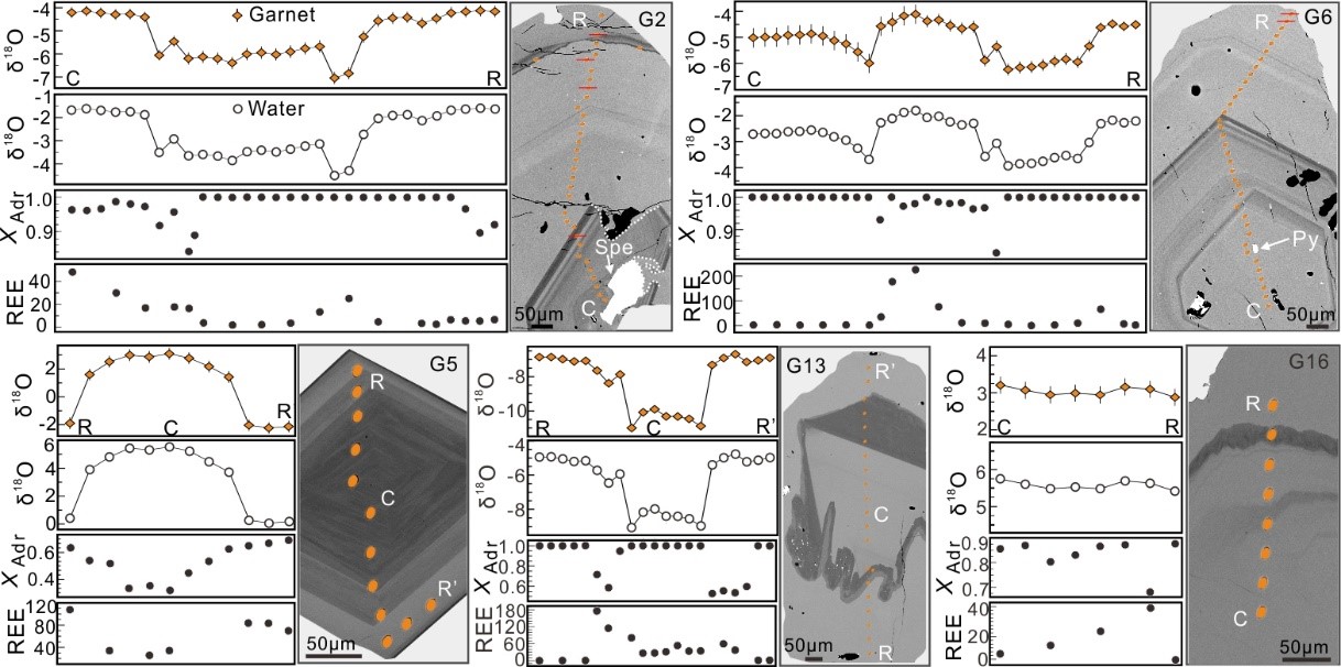 图1.不同成矿阶段代表性石榴石矿物颗粒的氧同位素组成及其变化特征,以及石榴石矿物成分及稀土元素含量与氧同位素之间的关系。XAdr:石榴石中的钙铁榴石端元组成;REE:稀土元素;Garnet:石榴石;Py:黄铁矿;Spe:镜铁矿;C:石榴石核部;R:石榴石边部