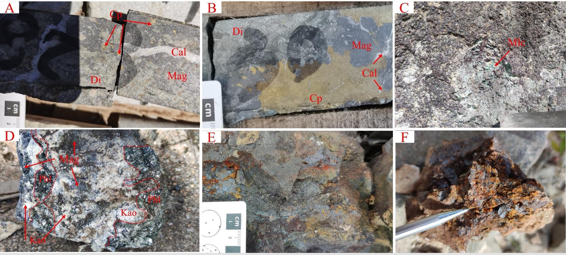 ,包括构造背景、地质特征和矿床成因等有了初步的了解。此次实地野外实习中,实习小组主要开展了以下几方面的工作:野外地表踏勘,了解矿区围岩和岩体特征;典型钻孔岩芯编录,了解斑岩铜矿蚀变、矿化与脉体之间的耦合关系;调度室参观学习,了解5G智能无人采矿机的工作流程;选矿厂参观学习,了解矿山选矿工艺流程。