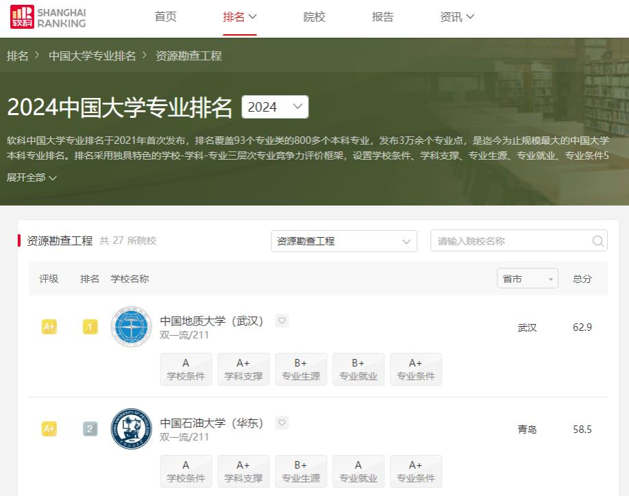 学院现有地质资源与地质工程、石油与天然气工程2个国家一级学科,其中地质资源与地质工程是国家重点学科,在国内学科评估中长期位列A+,连续两轮入选国家“双一流”建设学科;石油与天然气工程为湖北省重点学科,属于“双一流”建设带动学科,在2021年泰晤士高等教育学科评级中位列A+。学院现有资源勘查工程、石油工程、资源环境大数据工程3个本科专业。其中资源勘查工程专业是教育部一类特色专业,首批入选国家一流本科专业,在历年专业排名中均名列全国第一。石油工程专业入选湖北省一流本科专业。资源环境大数据工程专业于2022年获批教育部普通高等学校本科专业备案并于次年招生。