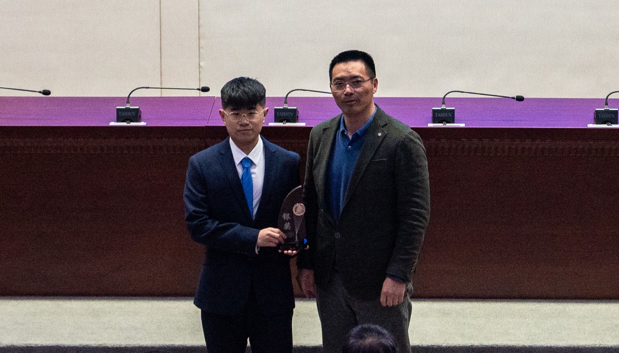院长严德天为“智热星合”创业团队颁发“第十八届大学生挑战杯创业计划竞赛”银奖奖杯。
