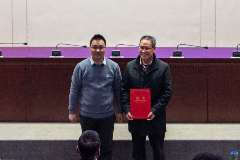 党委书记汪再奇为“源·创科协”指导顾问周江羽颁发聘书。